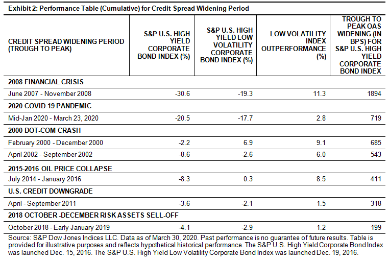Exhibit 2 displays the comparative performance of the S&P U.S. High Yield Low Volatility Corporate Bond Index during the most stressed scenarios of the past two decades. There are two key takeaways.