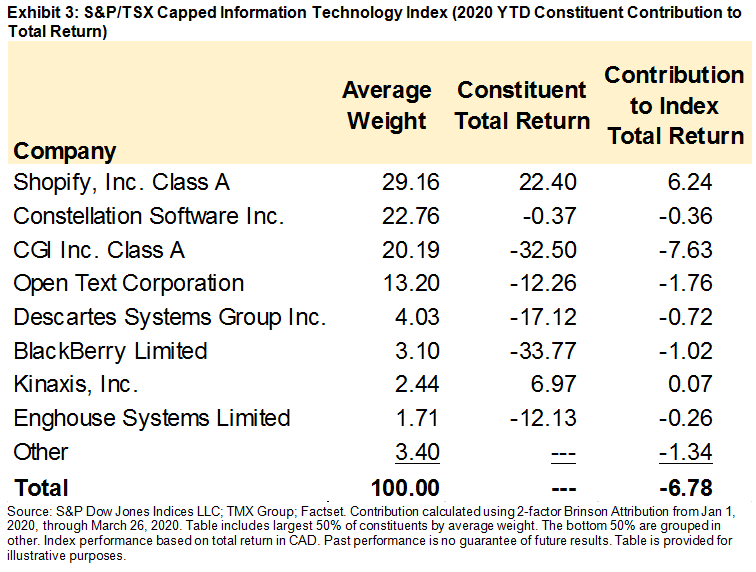 In addition, as most keen Canadian market observers are aware, Shopify, a leading provider of e-commerce software solutions to businesses, is the largest Canadian Information Technology company and has performed well in the recent environment. As Exhibit 3 illustrates, the strength of Shopify has been the largest single driver of S&P/TSX Capped Information Technology Index performance in 2020. However, other large constituents such as Constellation Software, Open Text Corporation, and Kinaxis contributed to the sector outperformance as well.