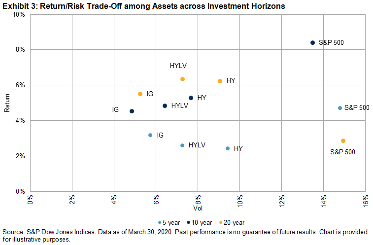 • For longer time periods (20 years), the S&P U.S. High Yield Corporate Bond Index delivered higher marginal returns than its broad-based high yield benchmark for every incremental unit of risk to investment-grade bonds.