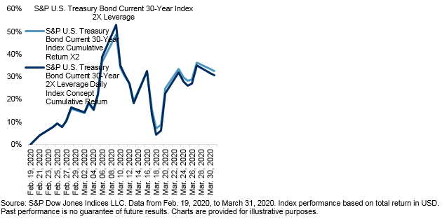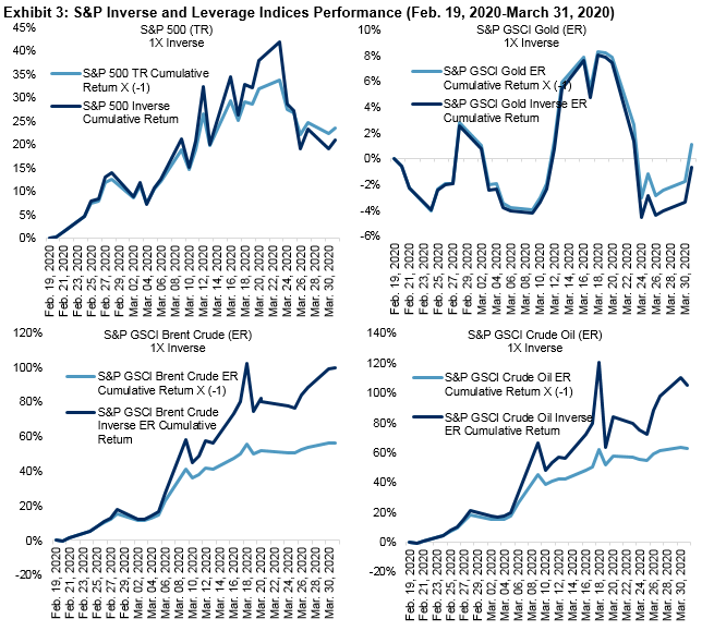 Further details on the S&P Leverage and Inverse Indices are available here: TalkingPoints: S&P Leverage and Inverse Indices. Additionally, the recent performance of key indices is displayed in Exhibit 3 (from Feb. 19, 2020, to March 31, 2020).