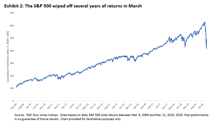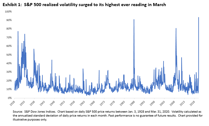 As COVID-19 dominated headlines, the S&P 500 finished with its worst quarterly total return (-19.60%) since Q4 2008’s 22% decline.  Matters would have been even worse had it not been for the S&P 500’s best 5-day total return since November 2008; the benchmark rose 17.4% between March 23 and March 30 to recover some of the prior losses.  [Through March 23, the S&P 500’s cumulative total returns since the start of the last bull market stood at the same level as in May 2017.]  Volatility goes both ways!