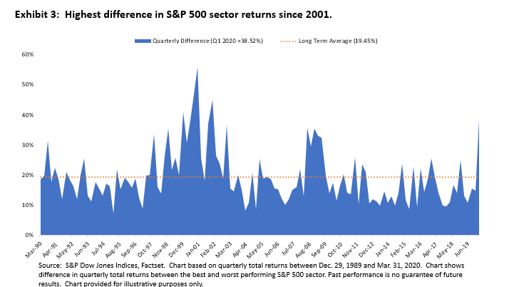 At a sector level, there was no place to hide to avoid declines in absolute terms in Q1: all S&P 500 sectors finished down for the quarter, only the seventh time this has happened since the end of 1989.  However, there was enormous value in identifying the relative winners or avoiding the relative losers: a whopping 38.5% separated the best performing sector in Q1 (Information Technology, -11.93%) and the clear laggard (Energy, down 50.45% amid oil prices plunges).  This quarterly difference was the highest since December 2001, and reflected a dramatic increase in stock and sector dispersion.
