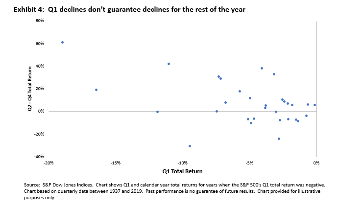 So what’s next?  Although the sea of red across dashboards makes for unpleasant reading, it is worth noting that first quarter declines don’t necessarily mean the rest of the year will be negative.  For example, the S&P 500 posted 31 negative first quarter total returns between 1937 and 2019.  In most cases (19), the benchmark posted a positive return over the next three quarters, including in 2009 when the S&P 500 fell more than 11% in the first three months before rising 42.11% over the last three quarters.