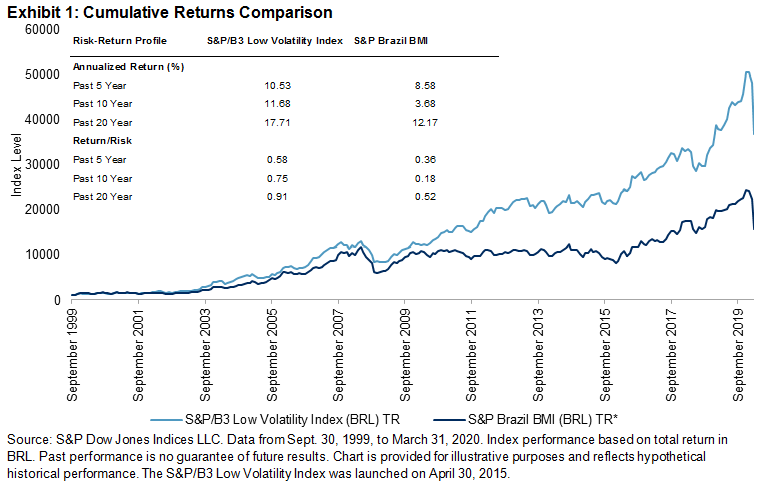 The COVID-19 pandemic hit the Brazilian equity market hard, causing the worst monthly performance since September 1999.[1] As measured by the S&P Brazil BMI, the Brazilian equity market lost 29.80% in March 2020. The S&P/B3 Low Volatility Index exceeded its benchmark by 640 bps during the same period. Moreover, the low volatility strategy presented superior cumulative and risk-adjusted returns over the 20-, 10-, and 5-year periods (see Exhibit 1).