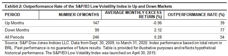 To highlight the behavior of the S&P/B3 Low Volatility Index in different market circumstances, we analyzed the monthly return data in up and down markets.[2] The results shown in Exhibit 2 are asymmetric, displaying some participation in the up markets and evident downside protection.