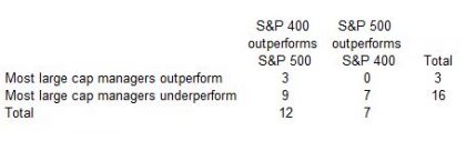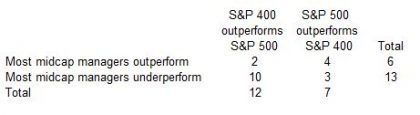 Midcaps beat large caps in each of the three years when the majority of large cap managers outperformed, suggesting that large-cap managers might have augmented their performance by tilting down the cap scale.  There were no years when the S&P 500 beat the MidCap 400 and the majority of large cap managers outperformed.
