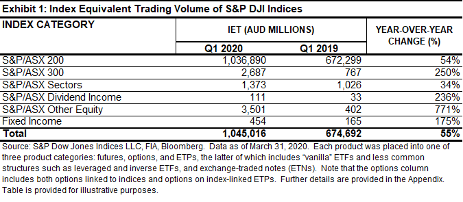 In Q1 2020, many market participants used the most liquid, transparent instruments available to manage their exposure to equities. Futures, options, and exchange-traded funds (ETFs) linked to the S&P/ASX Index Series saw record trading volumes, with over AUD 1 trillion in index-linked trading during the first quarter—a 50% increase from the first quarter of 2019. Trading was mostly concentrated in products tracking the S&P/ASX 200, but products tracking other S&P/ASX Indices saw larger relative increases, with trading tripling year-over-year in products associated with the S&P/ASX 300 and the S&P/ASX Dividend Indices.
