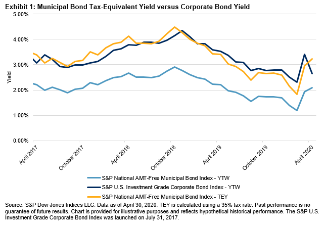 Meanwhile, municipal bonds experienced greater spread widening in March and did not see the extreme tightening that investment-grade corporate bonds did. As of April 30, 2020, the yield of the S&P National AMT-Free Municipal Bond Index was still more than 100 bps above its pre-COVID-19 low.