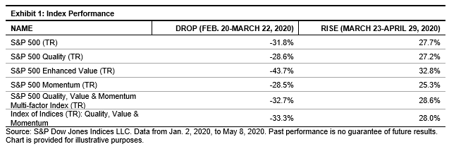 During the recent market sell-off, most of the factor indices declined until they reached a bottom in late March, before rebounding partially over the following month. Exhibit 1 shows the performance of single-factor indices and the two multi-factor combinations. While the S&P 500 QVM Multi-Factor Index’s outperformance over the IOI approach was not massive, it still did provide about 60 bps of excess return in both declining and rising phases of the market.