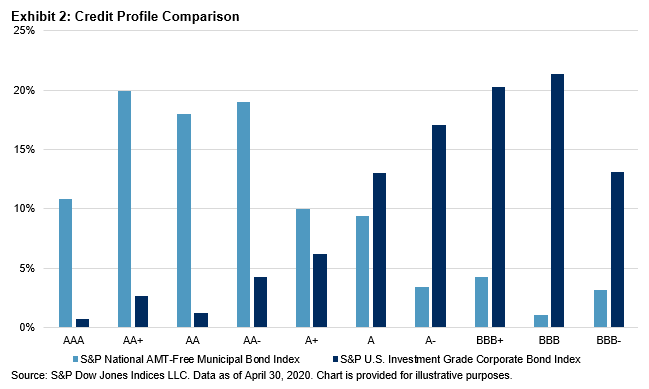 However, the overall credit quality of the municipal bond market is much better positioned to weather such potential hardships. Exhibit 2 compares the credit quality distribution of the S&P National AMT-Free Municipal Bond Index to that of the S&P U.S. Investment Grade Corporate Bond Index. While 55% of the investment-grade corporate bond market is ‘BBB’-rated, less than 9% of municipal bonds fall into the lowest rung on the investment-grade ladder.