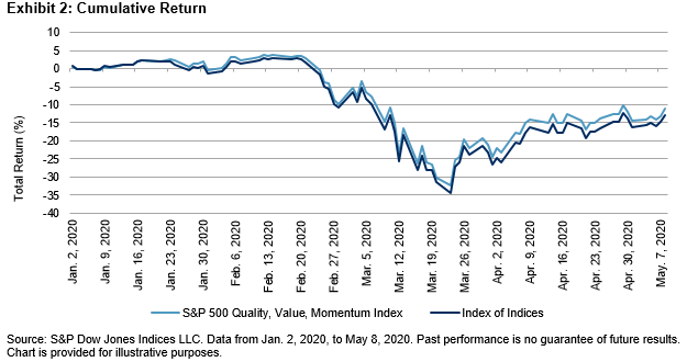 The S&P 500® Quality, Value & Momentum Multi-Factor Index is designed to measure the performance of stocks having the highest combination of quality, value, and momentum (QVM). It takes a “bottom-up” approach of scoring each stock on its individual factor attributes and selecting stocks that jointly score highest across all the factors [1]. In light of the recent market turbulence, let us examine the performance of this index in comparison with the alternative “top-down” approach to multi-factor portfolio construction, i.e., taking an equally weighted combination of single-factor indices, referred to as an “index of indices” (IOI)[2].