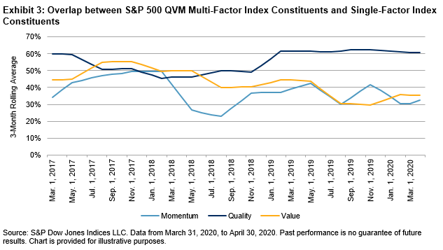 In order to see if there is any compositional bias that leads to this outperformance, we examine the overlap between the S&P 500 QVM Multi-Factor Index constituents and the individual factor index constituents. We quantify this overlap as the percentage of index weights held in common [3].