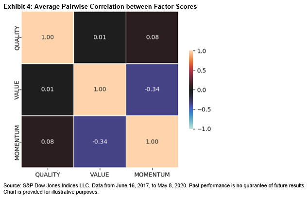Exhibit 3 shows that the S&P 500 QVM Multi-Factor Index tends to have a higher overlap with the quality factor (which has outperformed recently [4]), and a lower overlap with the value and momentum indices. This is partly due to a negative correlation between momentum and value exposures among S&P 500 constituents (see Exhibit 4), which implies that high-quality stocks have a better chance of being selected when constituents are sorted on an average of all three factor scores.