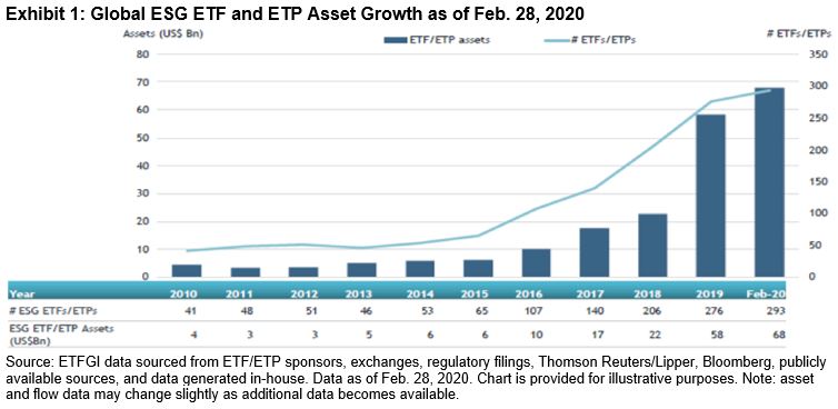 Investors are reimagining the future state of investing in the aftermath of the pandemic, and record flows into environmental, social, and governance (ESG) ETFs undoubtedly reflect that mindset (see Exhibit 1). Assets in ESG ETFs and ETPs listed globally increased by 4.93% at the end of February 2020, to a new record of USD 67.99 billion.[1]