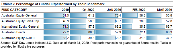As Exhibit 2 shows, for the three-month period ending March 31, 2020, 61.2% of funds in the Australian Equity General category were outperformed by the S&P/ASX 200. This was more or less in line with the results as of Dec. 31, 2019. What becomes more interesting is when we look at the results on a month-by-month basis, we saw a steady improvement in the performance of funds in that category across the three-month period, with the number of funds outperformed by the benchmark decreasing from 78.4% to 50.8%. To put this another way, in January 2020, 21.6% of funds outperformed the benchmark, in February 2020, this increased to 41.5%, and in March 2020, it increased to 49.2%. The volatile market appears to have provided active fund managers opportunities to outperform the benchmark, although the benchmark still outperformed greater than 50% of funds.
