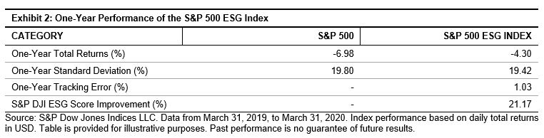 The S&P 500® ESG Index helps dispel the myth that a trade-off must exist between ESG principles and performance. Rather than detract from performance, ESG data can enhance visibility into financially material metrics that have not always been captured by traditional regulatory filings and standard financial analysis. In the past year, the S&P 500 ESG Index has provided a sustainable alternative to the iconic S&P 500, with similar risk and return, but with an additional lens into the constituents’ ESG principles (see Exhibit 2). While the recent outperformance is a welcomed result, it is important to note that the S&P 500 ESG Index does not aim to outperform its S&P 500 benchmark. It does, however, aim to achieve a considerable improvement in overall ESG performance by retaining companies with notable positive impacts such as an increase in female representation across management positions, a reduction in greenhouse gas emissions, and effective promotion of a risk culture.[3]