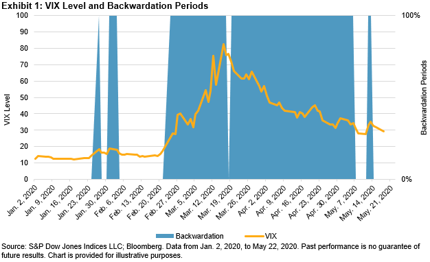 As pointed out in a recent VIX paper from the CFA Institute Research Foundation, the VIX futures curve is in contango about 80% of the time and usually goes into backwardation in distressed markets. On Feb. 24, 2020, the VIX futures curve flipped into backwardation, and it kept this downward sloping shape until May 6, 2020—the shaded area in Exhibit 1 shows the backwardation period of the VIX futures curve. However, the current price difference between the first- and second-month VIX futures is small, and the curve is more flat than upward sloping. In fact, the futures curve went back to mild backwardation on May 12 and May 13, 2020. This is unlike typical contango in VIX term structure.
