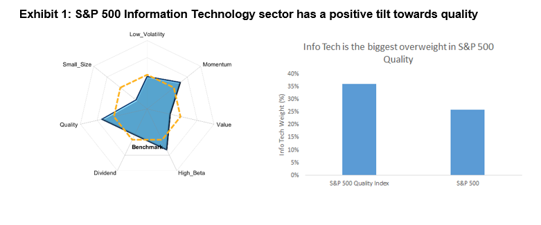 Sectors and factors are different ways of viewing the world, but they are not mutually exclusive.  We find an example of such a close, symbiotic relationship between the technology sector and the quality factor.  Exhibit 1 shows that the S&P 500 Information Technology index has a strong tilt towards quality, while the biggest overweight in the S&P 500 Quality Index is towards information technology.
