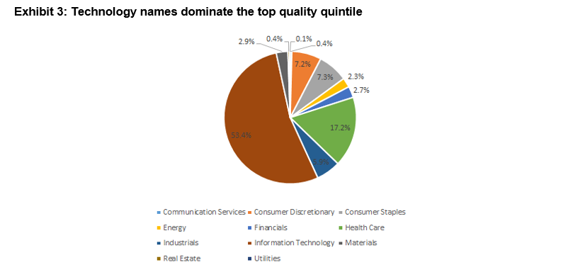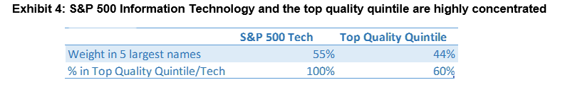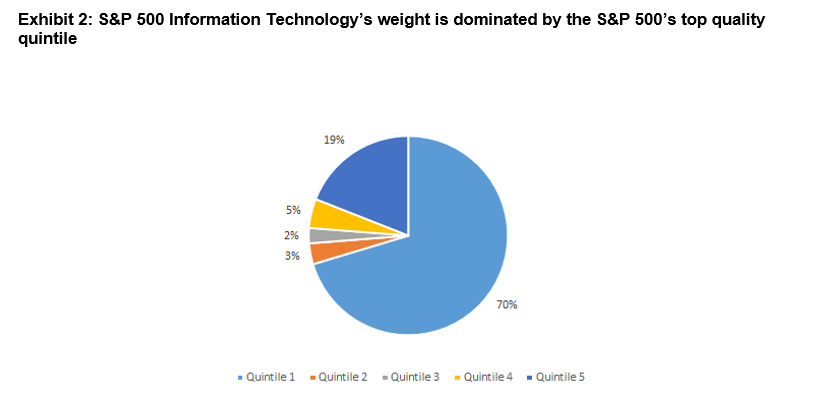 Exhibit 2 illustrates that an astonishing 70% of S&P 500 Info Tech’s weight is in the top quality quintile.