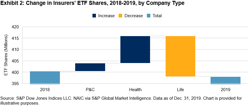 If we look at what drove the decline in insurers’ ETF shares now in terms of company type versus asset class, we see that while Property and Casualty (P&C) and Health companies were net buyers of ETFs in 2019, Life companies were net sellers (see Exhibit 2).