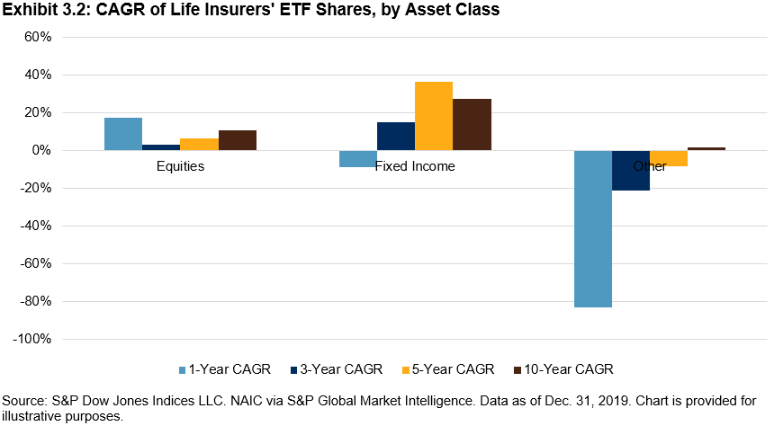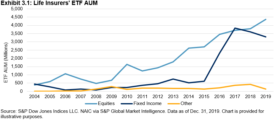 Life insurers sold fixed income ETFs last year, a reversal in the significant buying that took place between 2015 and 2017 (see Exhibits 3.1 and 3.2).