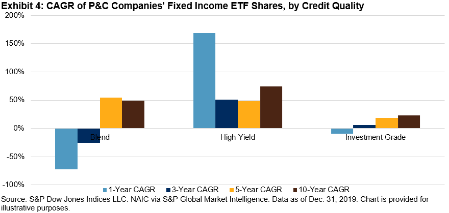 Fixed income ETF usage within insurance general accounts overall, however, continues to grow, with AUM up 13% year-over-year and shares up 11% year-over-year. While nearly 80% of insurers’ fixed income ETF AUM was in investment-grade bond ETFs, HY bond ETFs are gaining traction, particularly with P&C insurers, which increased their buying of HY bond ETFs by 169% in 2019 (see Exhibit 4).