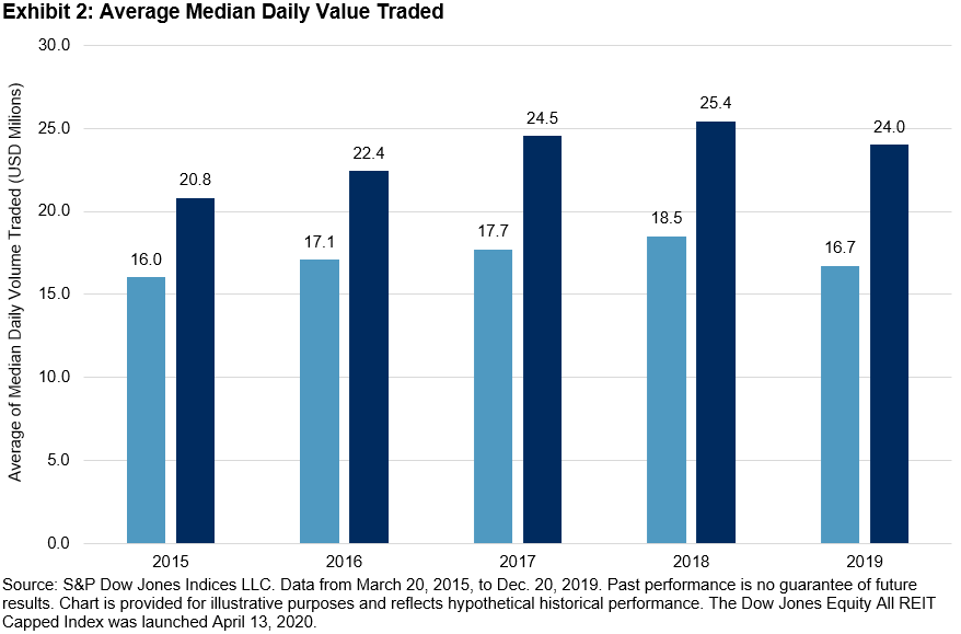 The additional market cap and liquidity criteria can potentially improve the tradability of the index. Exhibit 1 and 2 compare the FMC and MDVT[1] between the Dow Jones Equity All REIT Index and the Dow Jones Equity All REIT Capped Index. Over the past five years, the size and liquidity of the Dow Jones Equity All REIT Capped Index were higher by about 30% over its benchmark index.