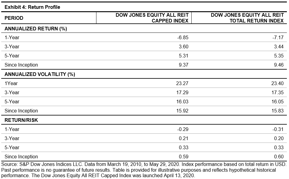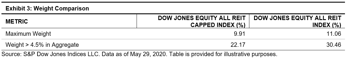 The multiple capping rules historically helped the Dow Jones Equity All REIT Capped Index reduce concentration and improve diversification. At each rebalancing, the weight of an index member is capped at 10%, and all constituents that have a weight greater than 4.5% in aggregate are limited at 22.5% of the index. Exhibit 3 shows the weight comparison as of May 29, 2020. The total weight of all constituents with a weight above 4.5% in the Dow Jones Equity All REIT Capped Index is 8.29% less than that of the uncapped version.