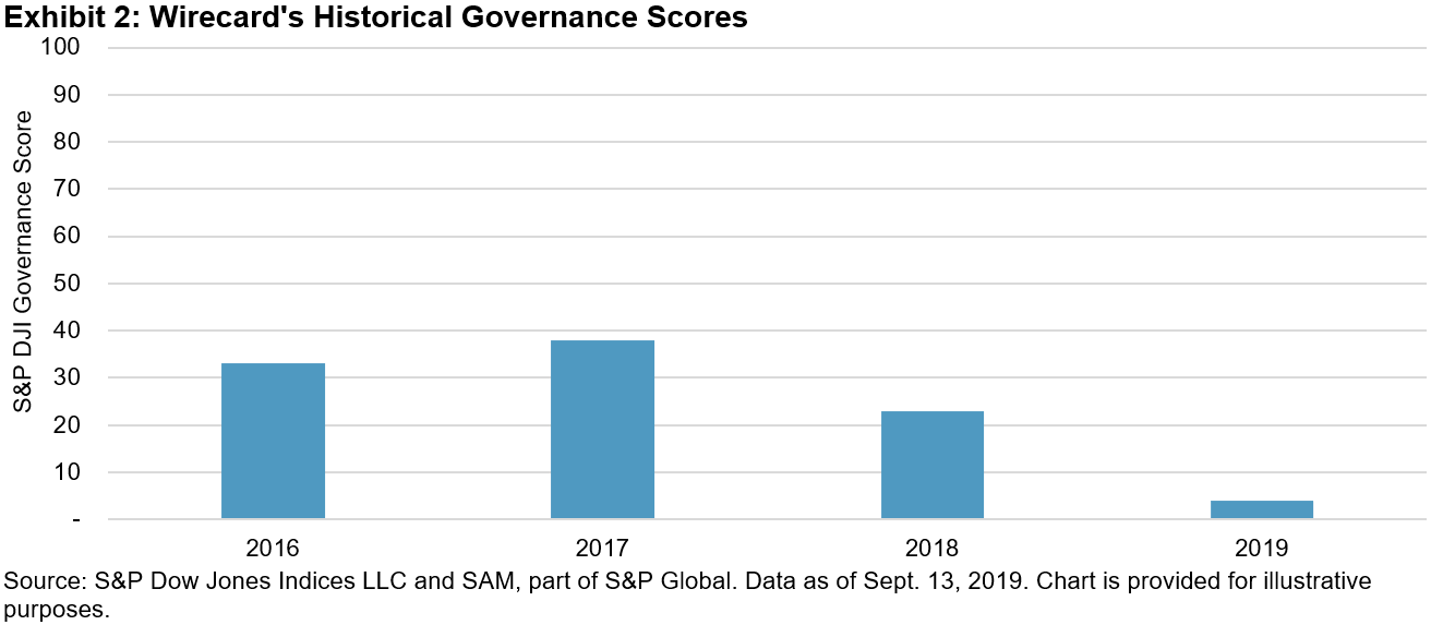 Wirecard’s struggles with governance are well documented by now. The financial-materiality-driven CSA framework was designed to identify a company’s sustainability performance from an ESG perspective. The combination of Wirecard’s ESG score plus the S&P ESG Index Series methodology appears to be fulfilling its intended design.