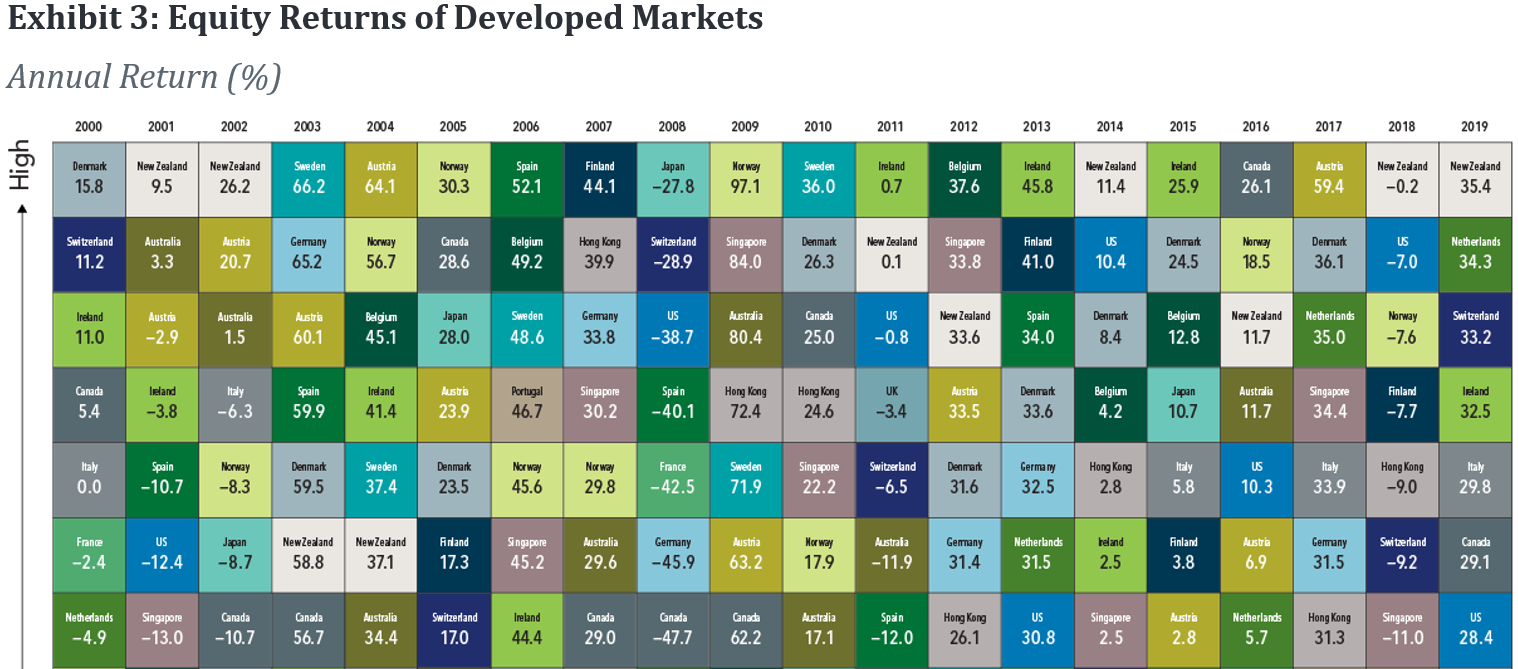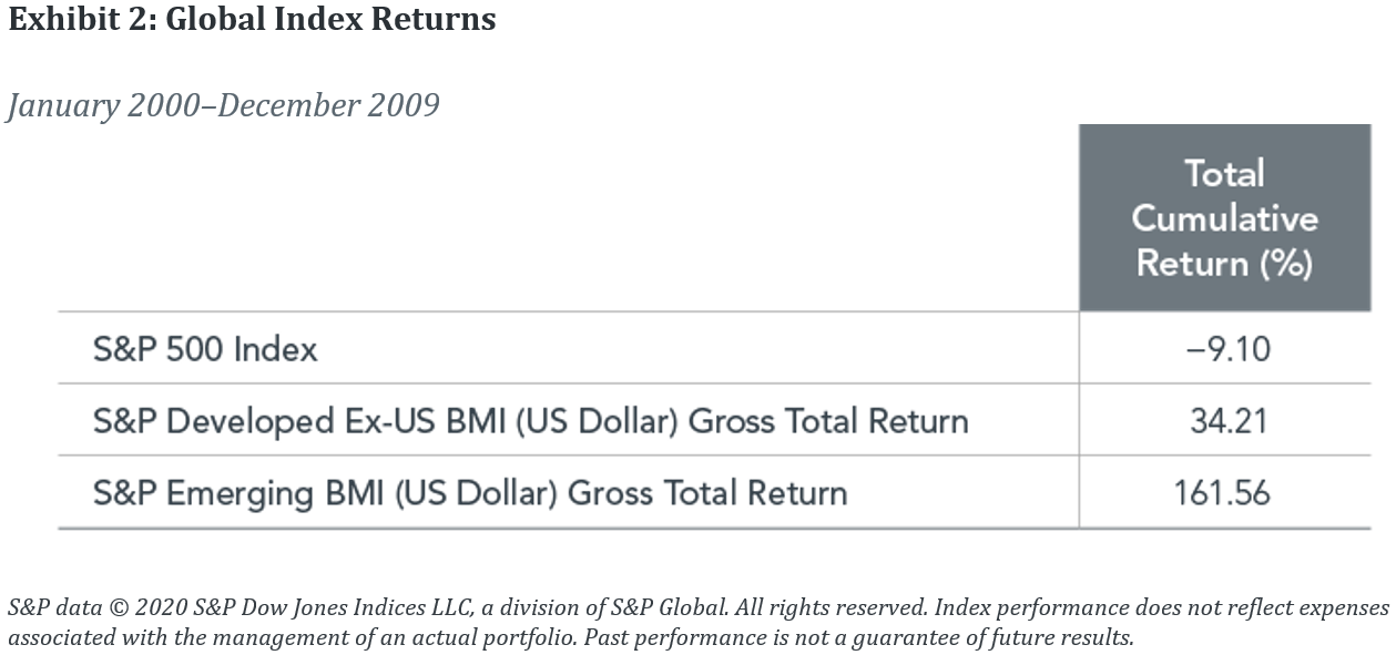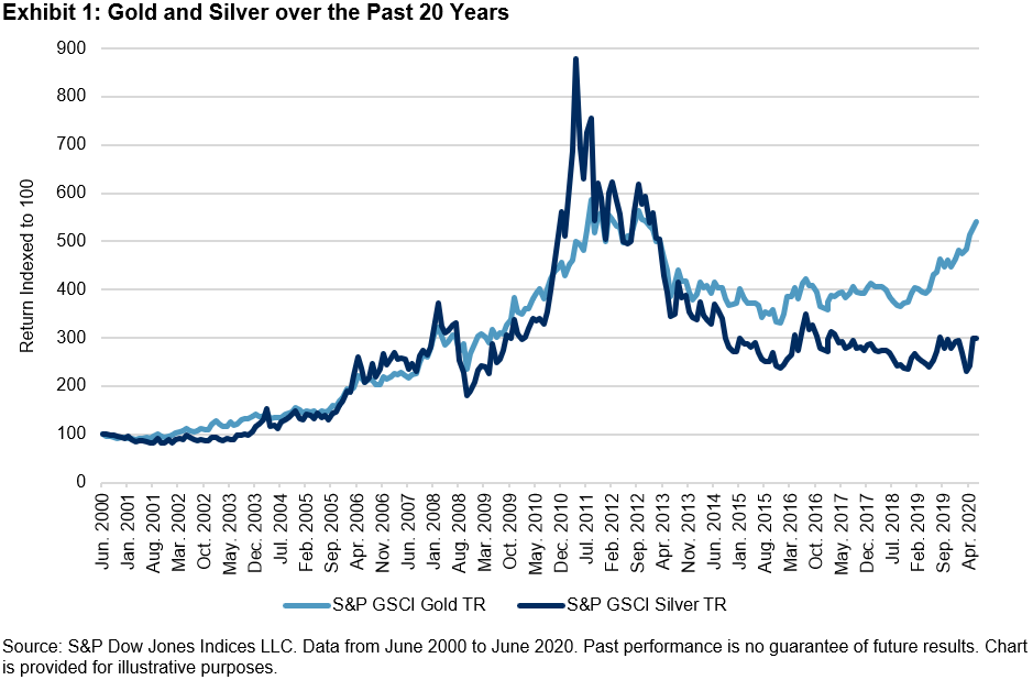 Silver has soared since mid-March 2020, fueled by renewed industrial demand and investor appetite for alternatives to gold and government bonds. From its low in mid-March, the S&P GSCI Silver was up 65% as of July 17, 2020. The less precious metal, silver, has lagged gold’s recent multi-year increase. The more volatile precious metal has historically overshot moves in gold prices (see Exhibit 1). This can occur before or after a large move in gold, so it does not always occur with a lag. Notice the outsized move of silver from September 2008 to April 2011. Is this time different?