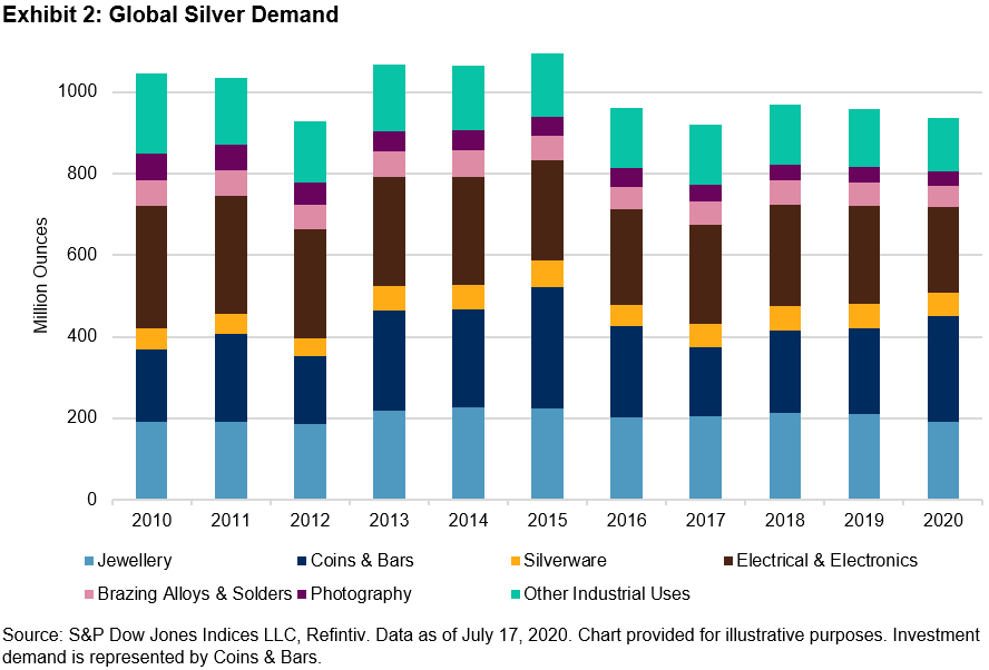 Over the past 20 years, silver’s monthly correlation to gold was 0.75—quite high, but not perfect. There is an important reason why silver isn’t perfectly correlated to gold. Industrial use is much higher for silver, accounting for more than 50% of demand. Investment demand for silver has risen over the past three years from a 10-year low, but it still only accounts for about half of the industrial demand. Typical industrial uses for silver include solar panels, automotive components, and medical devices. Although gradual, there has been a steady decline in the industrial use of silver over the past 10 years.