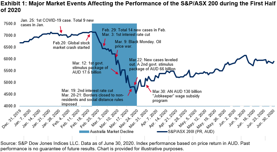 In our paper “How Smart Beta Strategies Work in the Australian Market,” we examined the long-term performance characteristics of S&P DJI’s Australian factor indices in different market trends. In the first half of 2020, the Australian equities market had a roller coaster response to the coronavirus outbreak, global market crash, and government stimulus packages. While most of the factor indices behaved similarly to their long-term performance characteristics, some did not. In this blog, we divided the first six months of 2020 into three time periods based on the varying price trends of the S&P/ASX 200 and reviewed how the Australian factor indices reacted in each of these different periods with the decomposition of their returns based on factor attributions for periods.