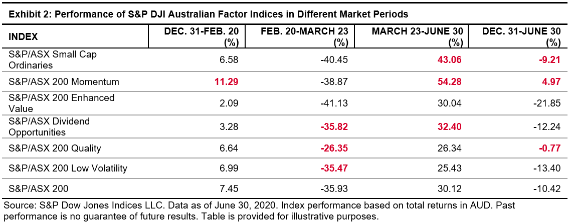 Following a series of health and safety measures (closing borders, imposing social distance rules), interest rate cuts, and government stimulus and subsidy packages, the S&P/ASX 200 started to rebound after touching its lowest point on March 23, 2020. The S&P/ASX 200 posted a gain of 30.1% during the market rally from March 23, 2020, to June 30, 2020. Historically, momentum, quality, and small-cap indices tended to outperform their benchmarks, while value, dividend, and low volatility tended to underperform during bullish markets. However, in this recent rally, the S&P/ASX Quality Index underperformed the S&P/ASX 200 by 3.8% while the S&P/ASX Dividend Opportunities Index outperformed by 2.3%.