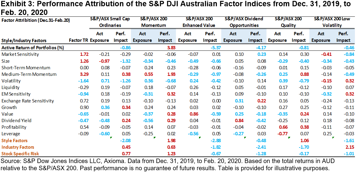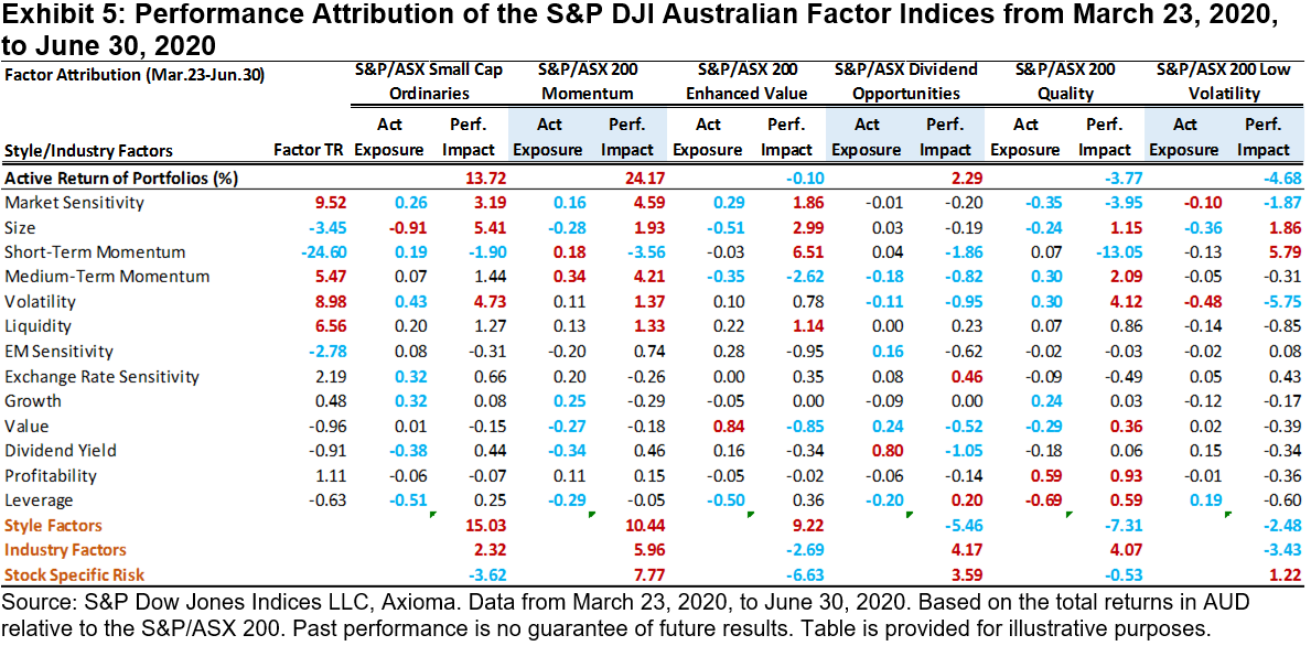 Momentum and quality factors have historically tended to outperform their benchmarks during uptrend markets. According to the factor attribution shown in Exhibit 3, style factors (especially medium-term momentum), industry biases, and stock-specific risk all positively contributed to the S&P/ASX Momentum return and resulted in strong outperformance during this period. For the S&P/ASX 200 Quality Index, despite the positive return impact contributed by style factors, industry biases (overweight in Steel and Insurance and underweight in Banks and REITs) and stock-specific risks were unfavorable for the S&P/ASX Quality Index return, and the index underperformed slightly for the period.