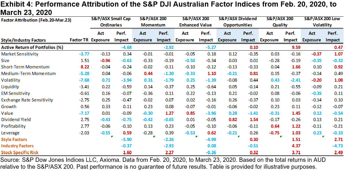 With increasing concerns about the coronavirus outbreak, global recession, and disruption to corporate supply chains and sales, the Australian market experienced a sharp decline starting on Feb. 20, 2020, together with the global stock market crash and oil price decline. Over the period from Feb. 20, 2020, to March 23, 2020, the S&P/ASX 200 dropped 35.9%. According to the factor index research outlined in our paper, quality and low volatility indices tended to outperform while value and small-cap indices tended to lag the benchmark during bearish markets.