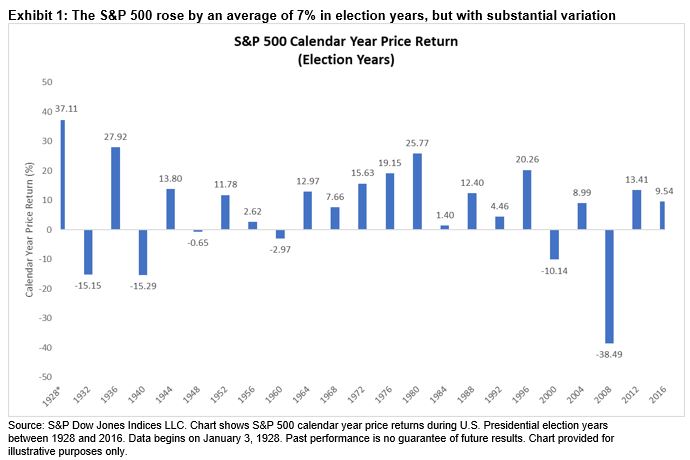 2020 has certainly been an extremely unusual year as economies, companies and individuals have grappled with the impacts of COVID-19.  Although this year’s market movements have arguably been even more difficult to predict than usual, and many active managers were wrong-footed earlier this year, investment outlooks have kept at least one eye on the outcome of one extremely well-telegraphed event – the U.S. Presidential election.  With November’s election less than three months away, what is the S&P 500®’s historical record around U.S. elections?