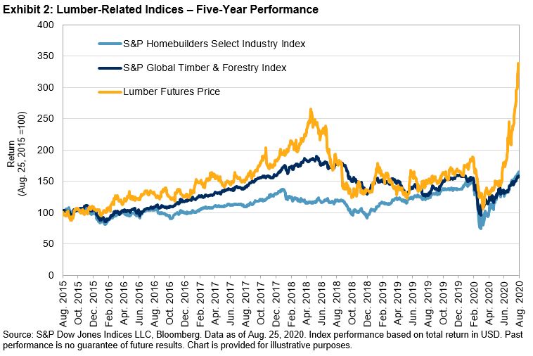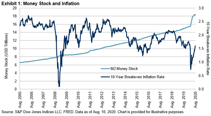 Movement in real asset prices has also sparked inflation fears. The S&P GSCI Gold, for example, was up 25% YTD as of Aug. 26, 2020, though the underlying dynamics likely extend far beyond a potential jump in inflation—gold’s rise also reflects general market fears of economic uncertainty and the sharp decline in bond yields we’ve seen already this year. To pick a commodity somewhat esoteric for the financial markets, but most decidedly “real,” lumber prices have also soared in the past four months, and recently reached record highs on the back of a surge in new home sales.