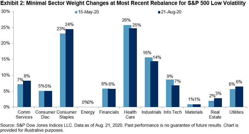 It’s not surprising to see that there were only minute shifts in sector allocations for the latest rebalance in the S&P 500 Low Volatility Index (effective after market close Aug. 21). With just 11 names cycling through the index, turnover was well below average. Weights in Energy and Financials continue to be depressed relative to the S&P 500. Notably, since the rebalance in May, Technology has had a higher weighting than Utilities, an occurrence that has only happened once, very briefly, since 1991. It seems the new regime that caused big sector shifts in the previous rebalance is, at the moment, here to stay.