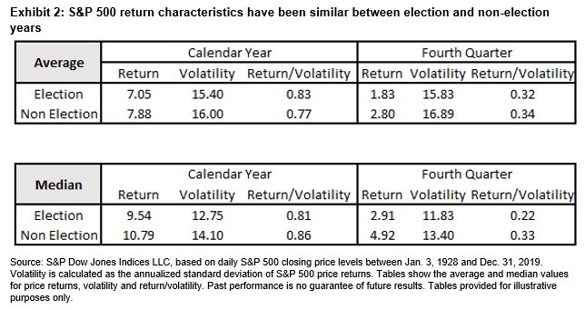 Before anyone uses Exhibit 1 to make inferences about the potential impact of the 2020 election on the S&P 500, it is important to recognize that the performance of the S&P 500 during election years has typically been similar to its performance during other years.  Exhibit 2 shows that the average (and median) calendar year S&P 500 price return, volatility and risk-adjusted returns have been similar across election and non-election years.  Similar results were also observed during the fourth quarter, albeit with slightly greater differences.