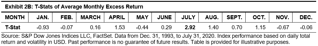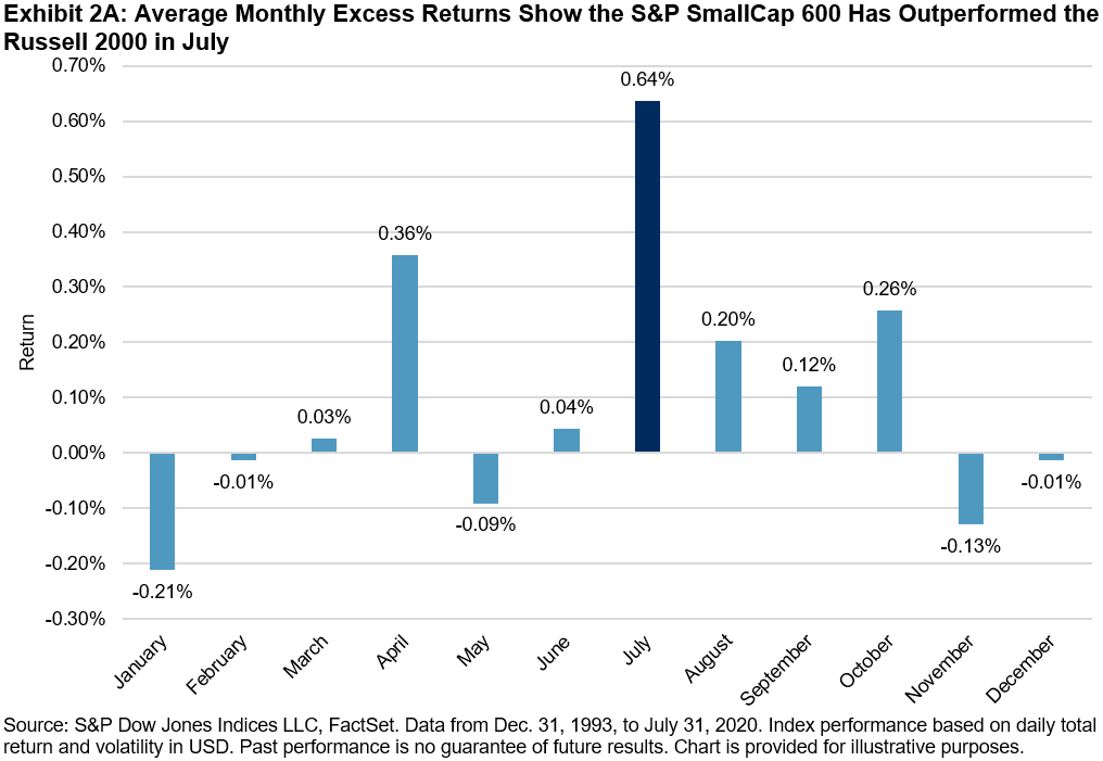 Exhibit 2A shows the differences in the average monthly returns of the S&P SmallCap 600 and the Russell 2000. The particularly notable average July outperformance of the S&P SmallCap 600 is 0.64% (t-stat = 2.92), as components entering the Russell 2000 at artificially elevated levels mean-revert. As a result, the S&P SmallCap 600 has outperformed the Russell 2000 in July for 19 of the 27 years observed (70.4%).