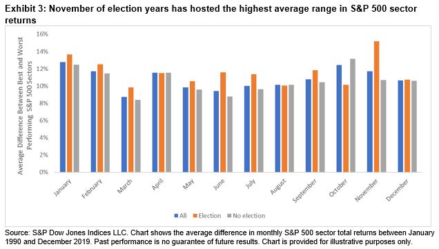 Although it can be difficult to identify a clear impact of U.S. Presidential elections at a market level, there appears to have been considerable impact at a sector level.  Exhibit 3 shows the average range in monthly S&P 500 sector returns – calculated as the best-performing sector minus the worst performing sector – between 1990 and 2019.  The highest average range (15.18%) was observed in November during election years, far above the 10.8% average difference across all months.  Notwithstanding the relatively small sample size, this suggests that election impacts were typically observed when investors priced-in the anticipated impact of the election winner’s policies on different market segments.
