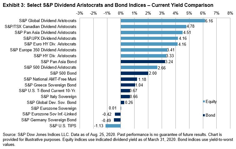 If they do, they might be wise to discern between companies that can maintain a steady stream of cash payouts to shareholders, and those that (perhaps due to a collapse in price) have a high dividend yield. The S&P Dividend Aristocrats® Indices are designed to track the performance of companies with a long history of maintaining or increasing their dividends per share, and that accordingly might be hoped to continue to do so. While those stocks classified as “Aristocrats” are not always those with the highest dividends, the yields on this series of indices can also be quite chunky: the S&P Global Dividend Aristocrats, for example, boasts a 6.2% yield.