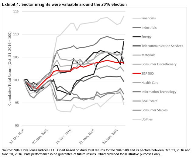 One recent example of this dynamic came in the 2016 election. While the S&P 500 rose around 4% in November 2016, a whopping 19.34% separated the best-performing sector (Financials) and the worst-performing (Utilities). Hence, correctly identifying who would win the 2016 Presidential election and the anticipated sector impact offered considerable value in 2016.