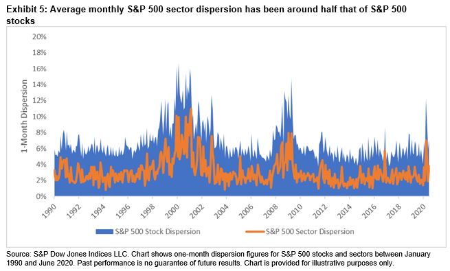 As a result, although the S&P 500 has been unperturbed by election outcomes, historically, evidence suggests it may be worthwhile to consider the potential benefits of using sectors to express views.  Indeed, not only can picking sectors offer around half the potential value of stock-picking – Exhibit 5 shows that the average monthly S&P 500 sector dispersion (3.08%) was around half the average S&P 500 stock dispersion (6.77%) – but S&P 500 sectors have offered greater capacity for investors looking to express views.