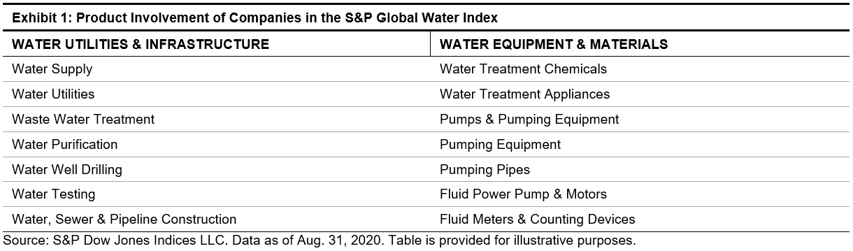 The S&P Global Water Index is designed to track 50 of the largest publicly traded companies involved in water-related business activities through two distinct clusters: Water Utilities & Infrastructure and Water Equipment & Materials.