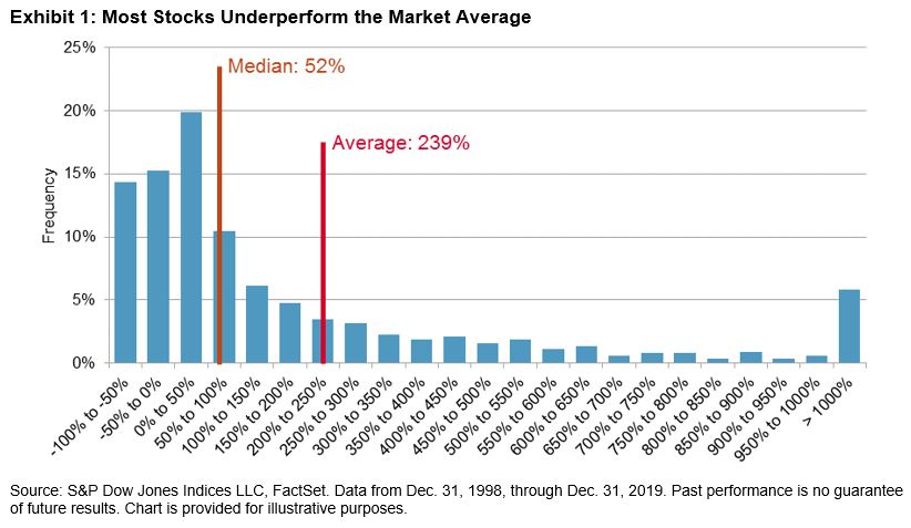 Skewness. The distribution of stock returns is skewed—i.e., most stocks underperform the market average. Exhibit 1 illustrates this for the S&P 500.