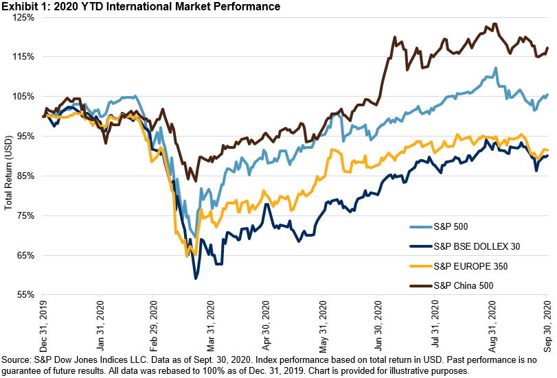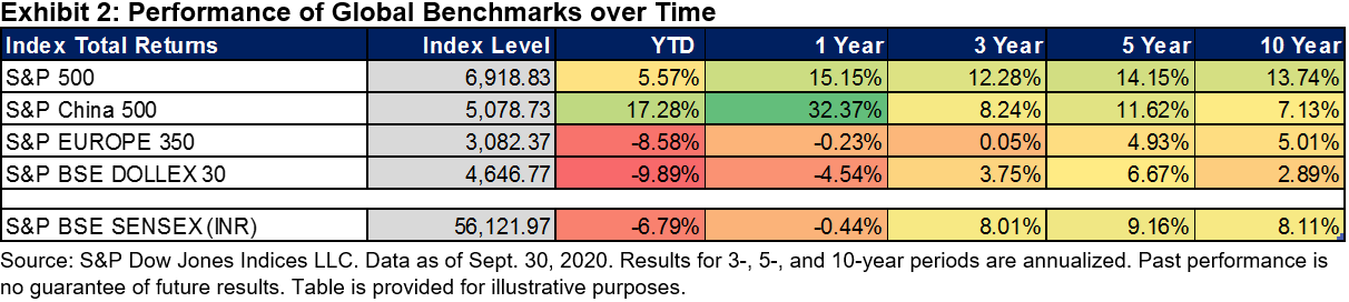 Exhibit 1 compares the YTD trends in the S&P BSE SENSEX with a range of global indices calculated by S&P DJI, including our benchmarks for the U.S., Europe, and China. As the chart makes clear, 2020 has been a year in which global diversification could have helped Indian investors. Note that the S&P BSE DOLLEX 30 is the U.S. dollar equivalent of the Indian rupee-denominated S&P BSE SENSEX; for purposes of comparison, the performance of all indices is shown in U.S. dollars.