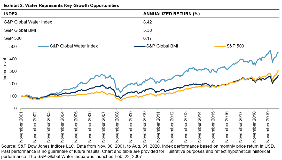 Over a long-term investment horizon, the S&P Global Water Index performed better than the broad-based global equity benchmark, the S&P Global BMI, by 3.04% per year since its inception on Nov. 30, 2001 (see Exhibit 2).