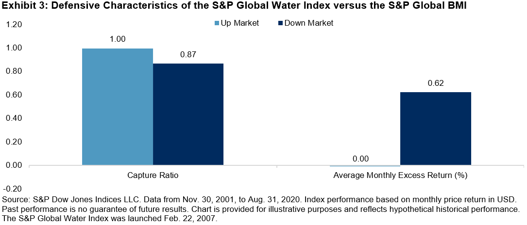 The S&P Global Water Index demonstrated stronger defensive characteristics than the global equities market, with a lower downside capture ratio and higher upside capture ratio (see Exhibit 3).