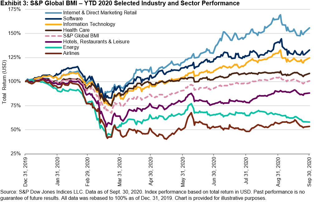 The global opportunity set offers a wide range of sectors and companies—within them, the likes of Microsoft, Apple, Amazon, and Facebook, that have benefited from the move toward virtual workplaces, virtual shopping, and higher spending on communications and technology. Using the S&P Global BMI, Exhibit 3 highlights the performance of certain global equity sectors and industries that showed both substantial gains and declines this year, illustrating the strength of the market’s trends. While airlines and energy companies have seen steep declines across the world, the soaring shares of global software, IT, and internet companies have offered refuge to those who had made an allocation.
